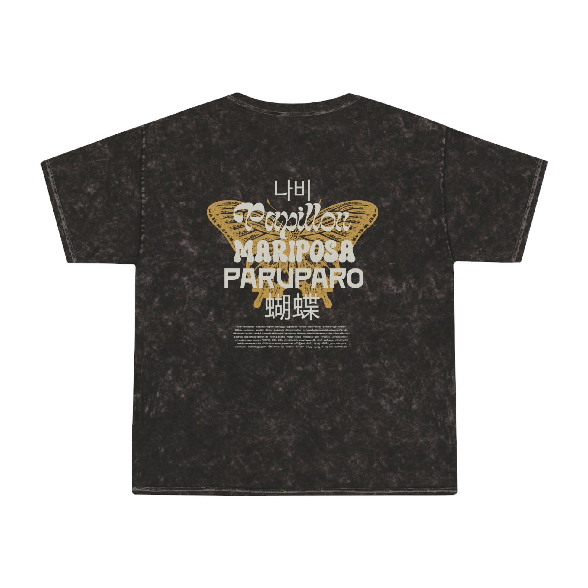 Butterflies are loved globally! This design features the translation of the word "butterfly" in many languages. Can you find yours? The 100% soft, heavyweight cotton construction and the seamless, double-needle crew collar give this tee a superior feeling of comfort and an impressive durability factor. Each mineral wash tee is hand-dyed to achieve groovy looks that feel originally retro.