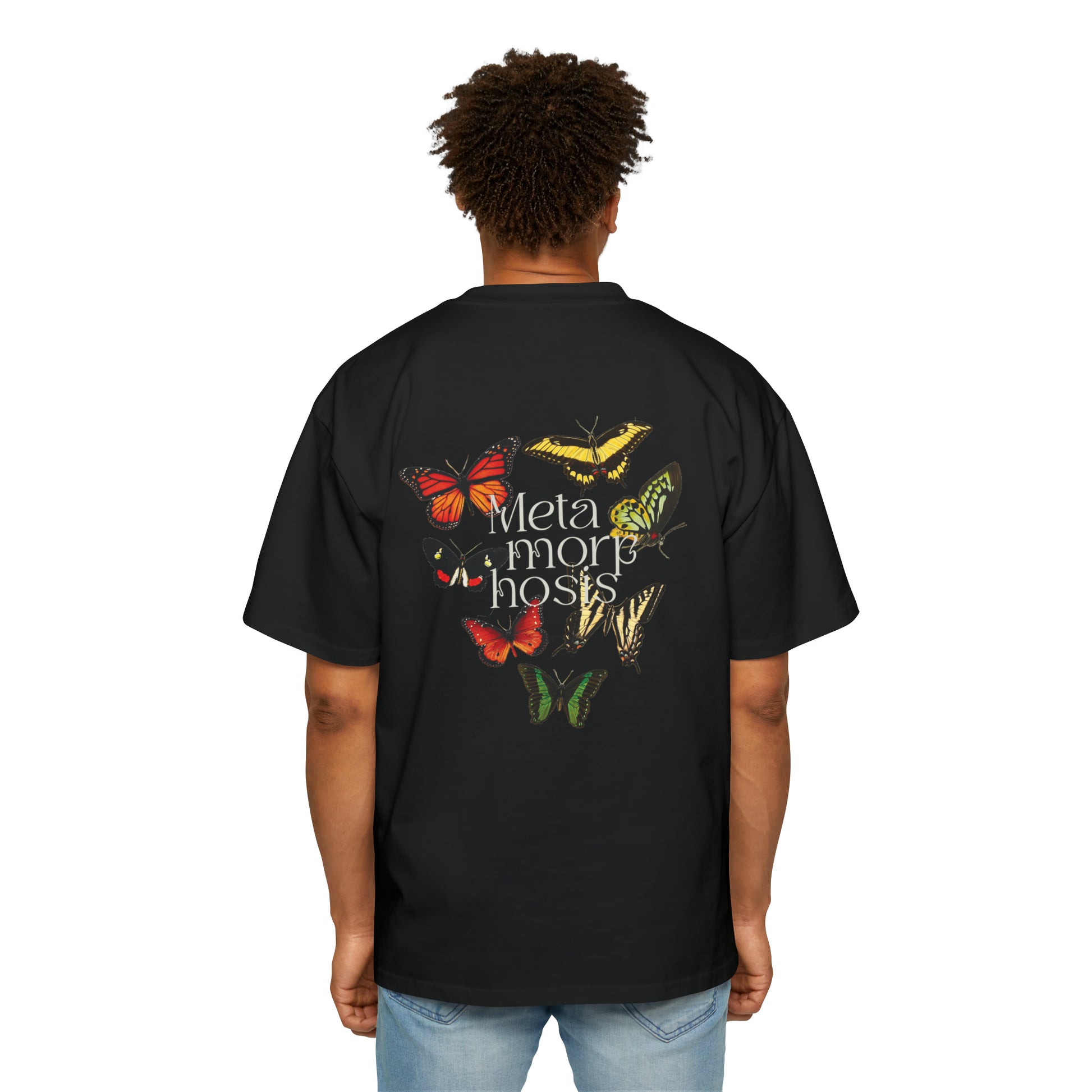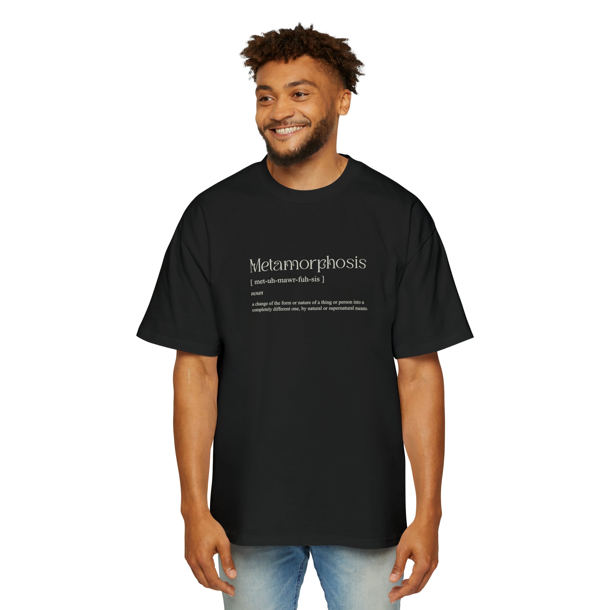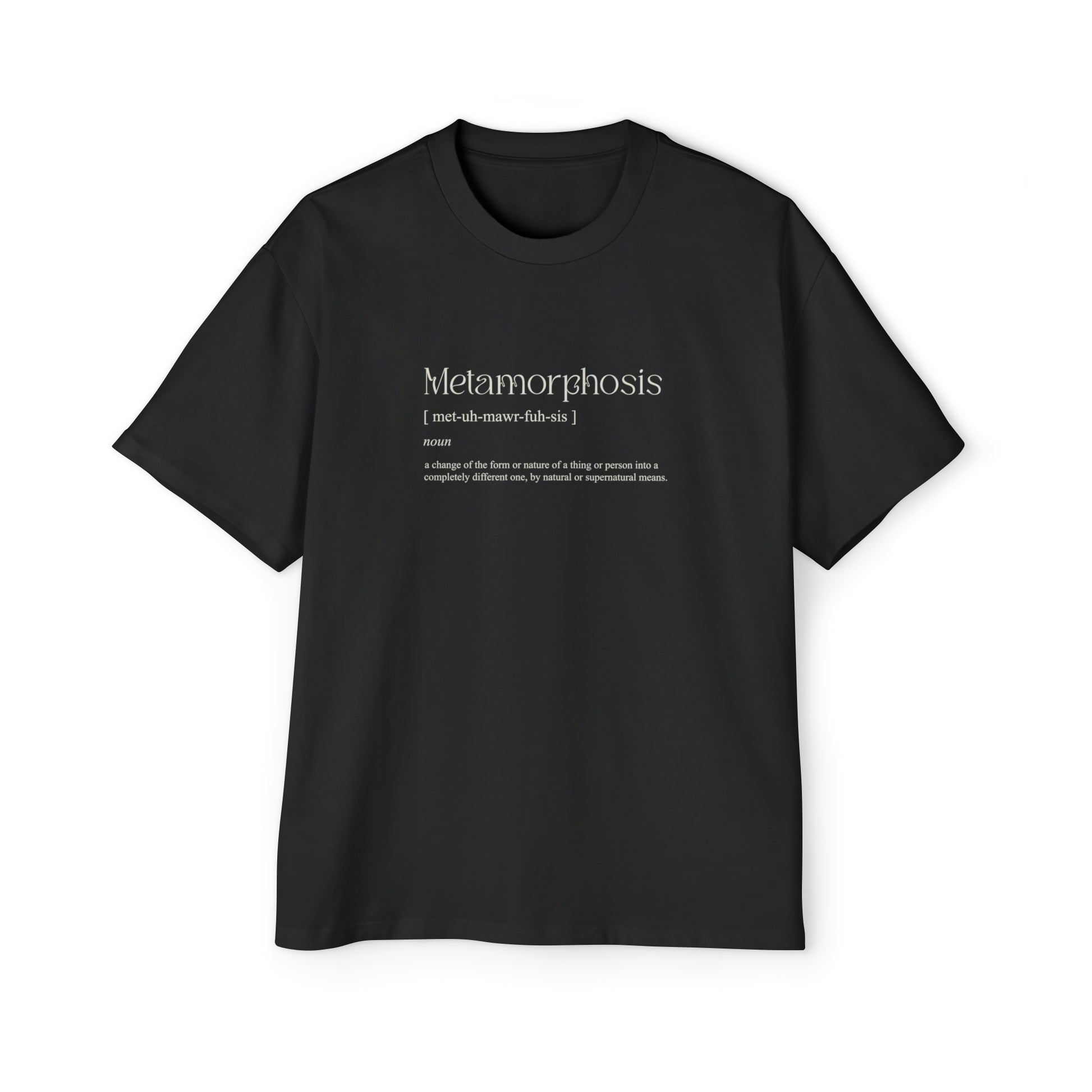 This shirt signifies the change of the form or nature of a thing or person into a completely different one, by natural or supernatural means. Its fit is oversized and passes the coziness test with flying colors. Made with 100% carded cotton, it feels like a heavy, warm hug that is perfect for colder days. Meanwhile the dropped shoulders along with the boxy fit, make it the perfect choice for any casual setting.